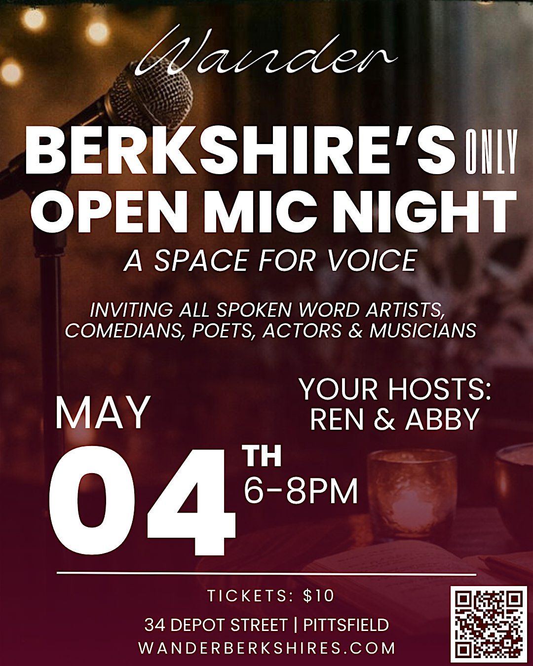The only open mic in the Berkshires built specifically for spoken word, this is your stage. Are you working on a bit? tightening a slam poem? rehearsing a soliloquy? This is the night for you. Musicians are welcome (limited slots), but the focus is voice! Come be part of a fun, supportive space to try, fail, refine, and be heard.