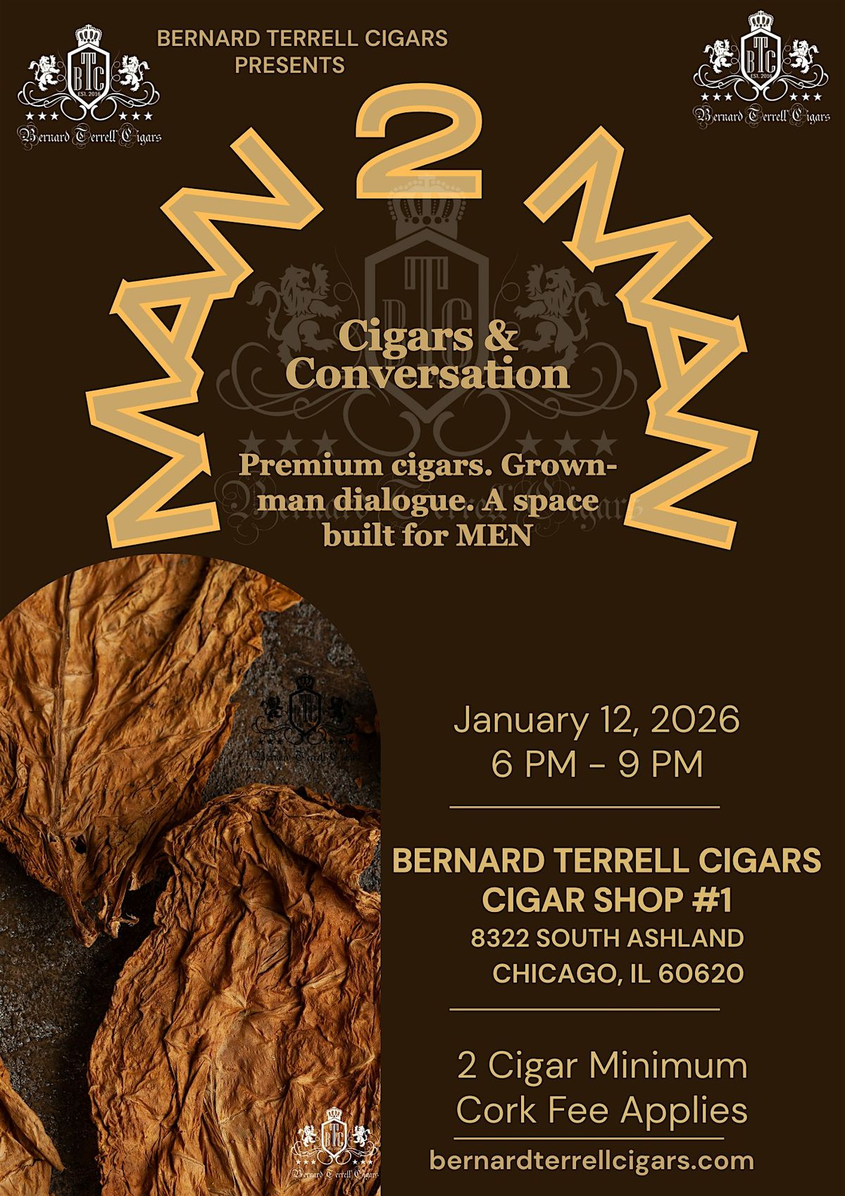 A conversation.Man 2 Man returns for the 2026 season — a bi-monthly gathering curated by Mr. BTC for men who value substance, class, and connection.Premium cigars. Grown-man dialogue. A space built for MEN.2 Cigar Minimum