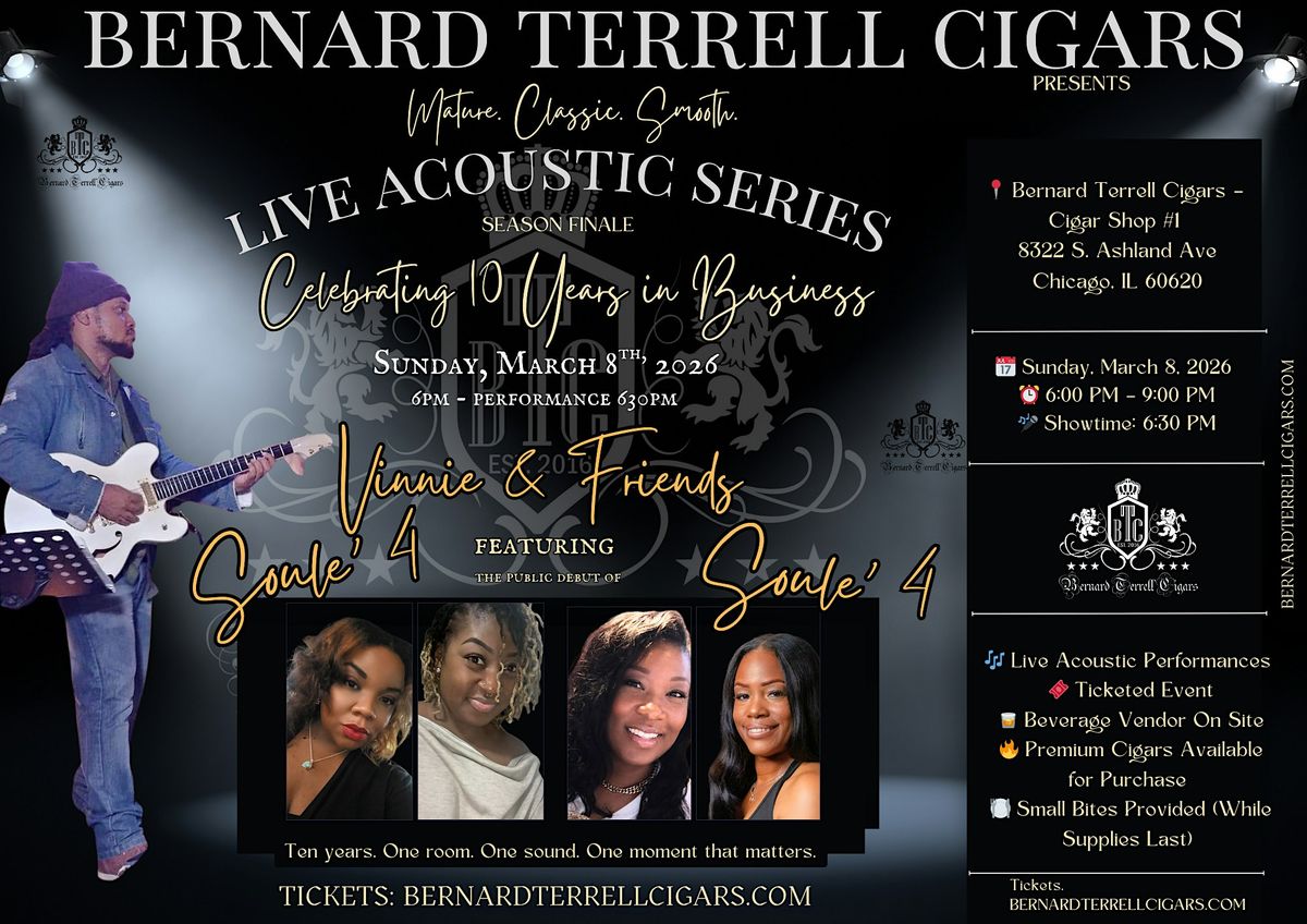 Join us for an intimate and unforgettable evening as Bernard Terrell Cigars closes the season and continues the celebration of 10 years in business with our Live Acoustic Series: Season Finale.
