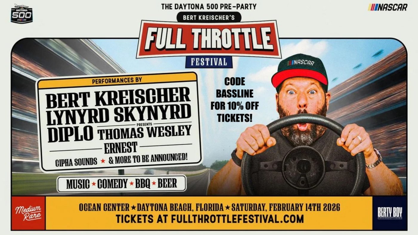 Bert Kreischer goes Full Throttle! Join the inaugural Full Throttle Festival on Saturday, Feb 14 at Ocean Center for music, comedy, BBQ, beer, and unforgettable energy. Headliners include Lynyrd Skynyrd, Diplo Presents Thomas Wesley, ERNEST, and comedy from Bert Kreischer, Cipha Sounds, plus more to be announced.