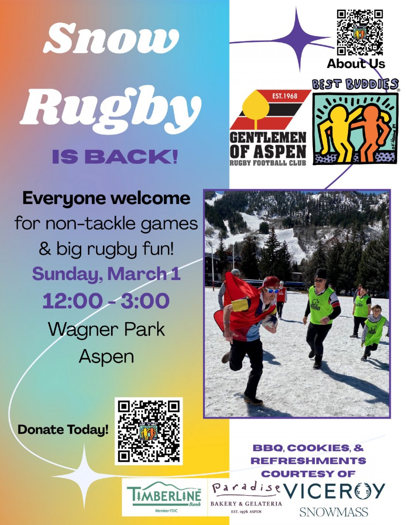 Snow Rugby is back! Everyone welcome! Join Best Buddies and Gentlemen of Aspen for non-tackle games and big rugby fun! Rain or shine! BBQ and refreshments compliments of Timberline Bank Aspen, Paradise Bakery, and Viceroy Snowmass.