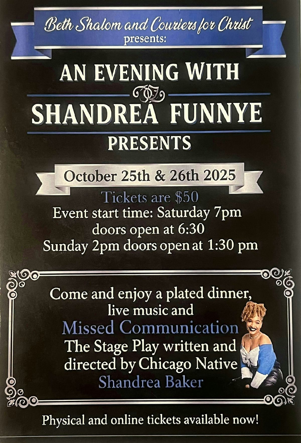 Welcome to Beth Shalom and Couriers for Christ Ministries as they host a stage play "Missed Communication" written and directed by Chicago native Shandrea Funnye.