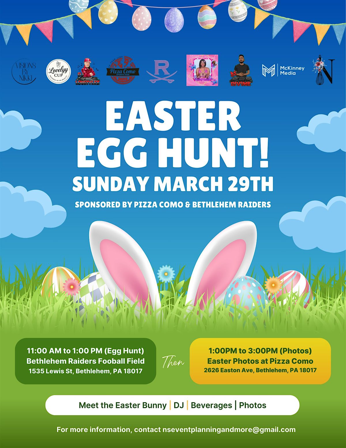 Join us for an Easter Egg Hunt at Bethlehem Raiders Football Field, followed by Easter Bunny photos at Pizza Como.