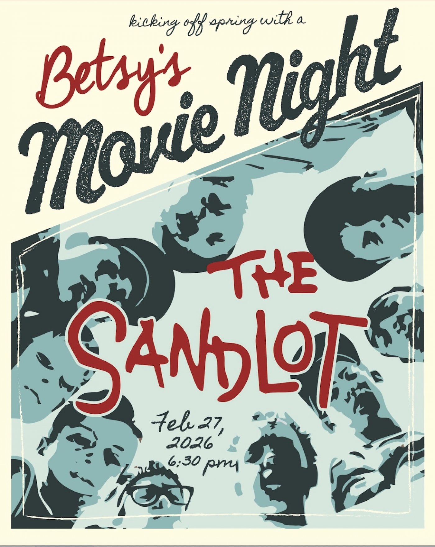 Join us on Friday, February 27 at 6:30 PM as we kick off Spring with the all-time favorite movie, The Sandlot! Laughs and Big Throwback Fun on the Big Screen at Betsy's! Don't Miss it!