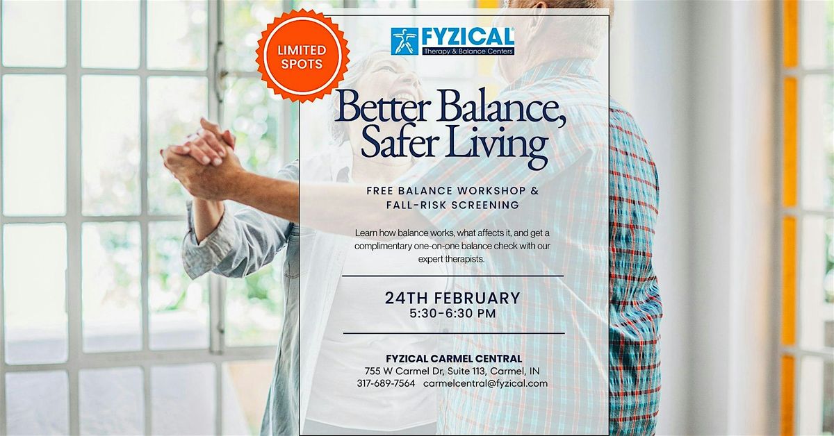 Join us for a FREE Balance Workshop + Fall-Risk Screening at FYZICAL Therapy & Balance Centers, Carmel. Learn how balance works, what affects it, and receive a complimentary one-on-one balance screening with our expert physical therapists.