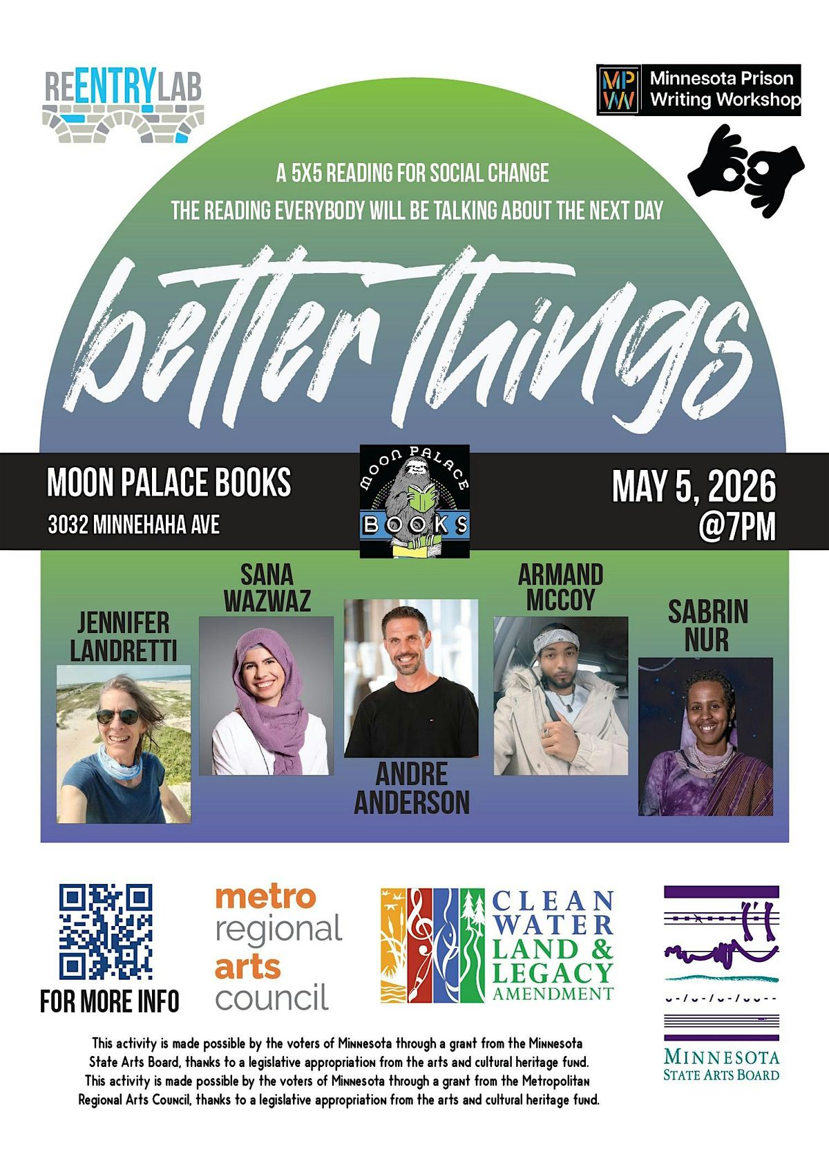 Better Things is a series of events sponsored by the ReEntry Lab, in partnership with the Minnesota Pr*son Writing Workshop (MPWW) and Moon Palace Books. The ReEntry Lab is an organization working to connect writers and other artists leaving incarceration to a community that’s ready to receive them.