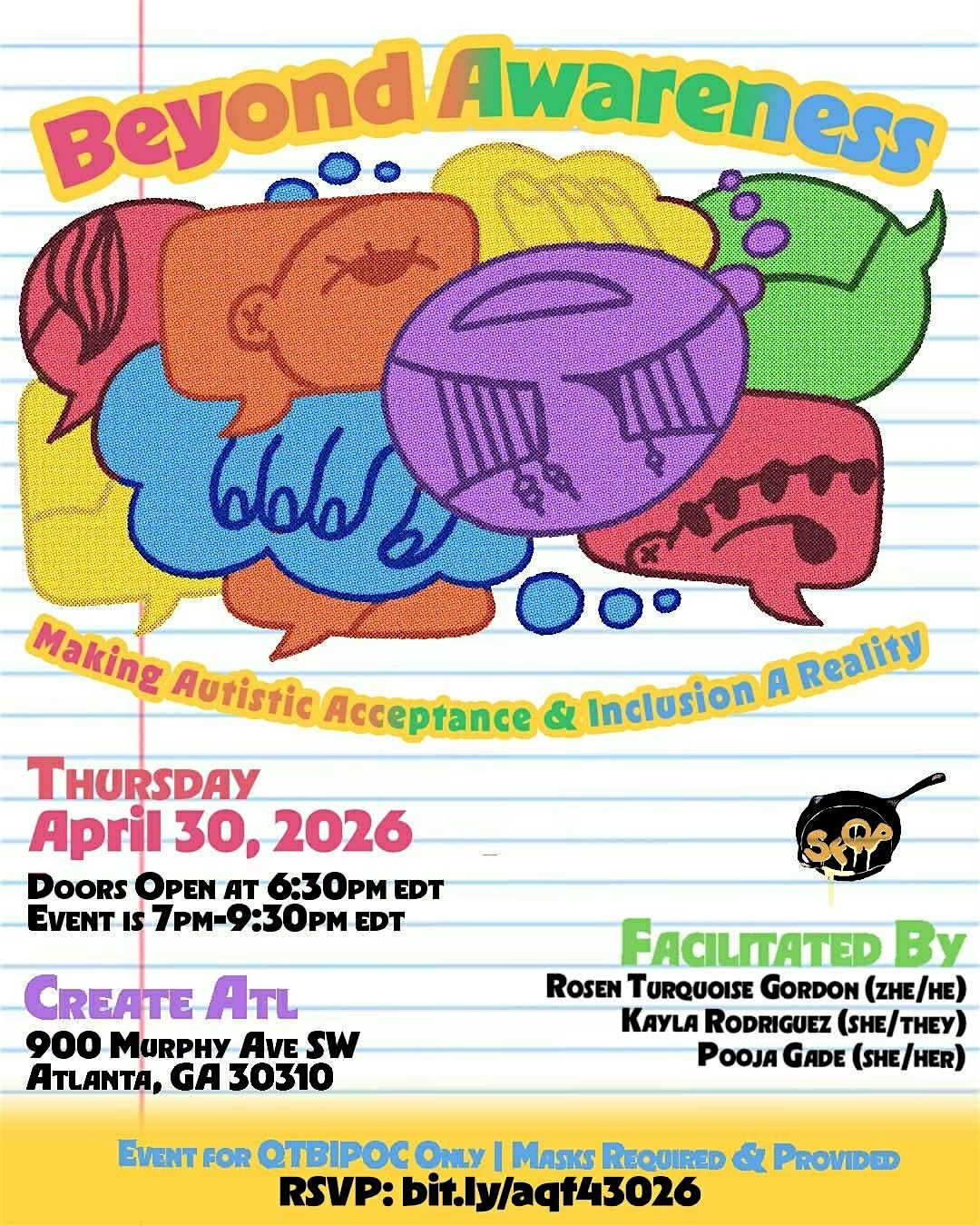 đ˘ Save the date for Beyond Awareness: Making Autistic Acceptance & Inclusion A Reality, happening Thursday, April 30th at Create ATL (900 Murphy Ave SW Atlanta, GA 30310). Facilitated by Rosen Turquoise Gordon (zhe/he) and Kayla Rodriguez (she/her), enjoy this intentional space for autistic queer folks & allies to meet, share experiences, and more!â