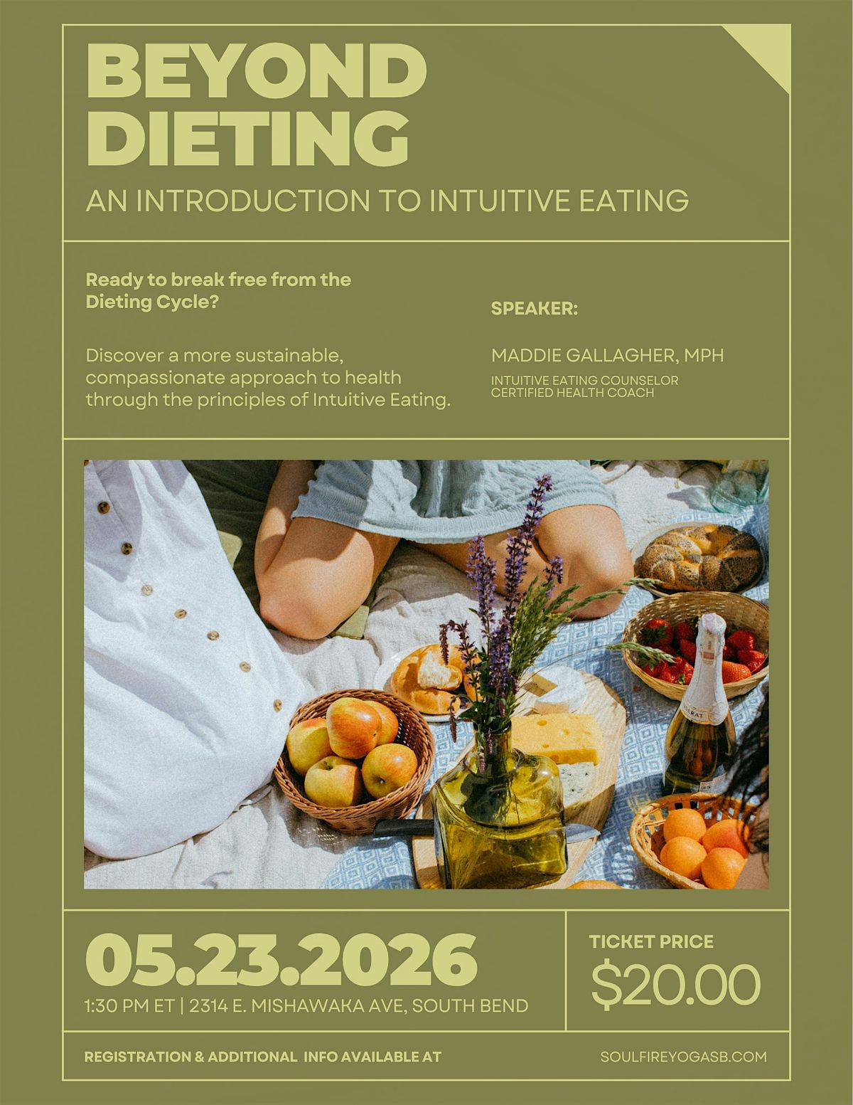 Registration Required - Register here: https://www.soulfireyogasb.com/event-details/beyond-dieting-an-introduction-to-intuitive-eating