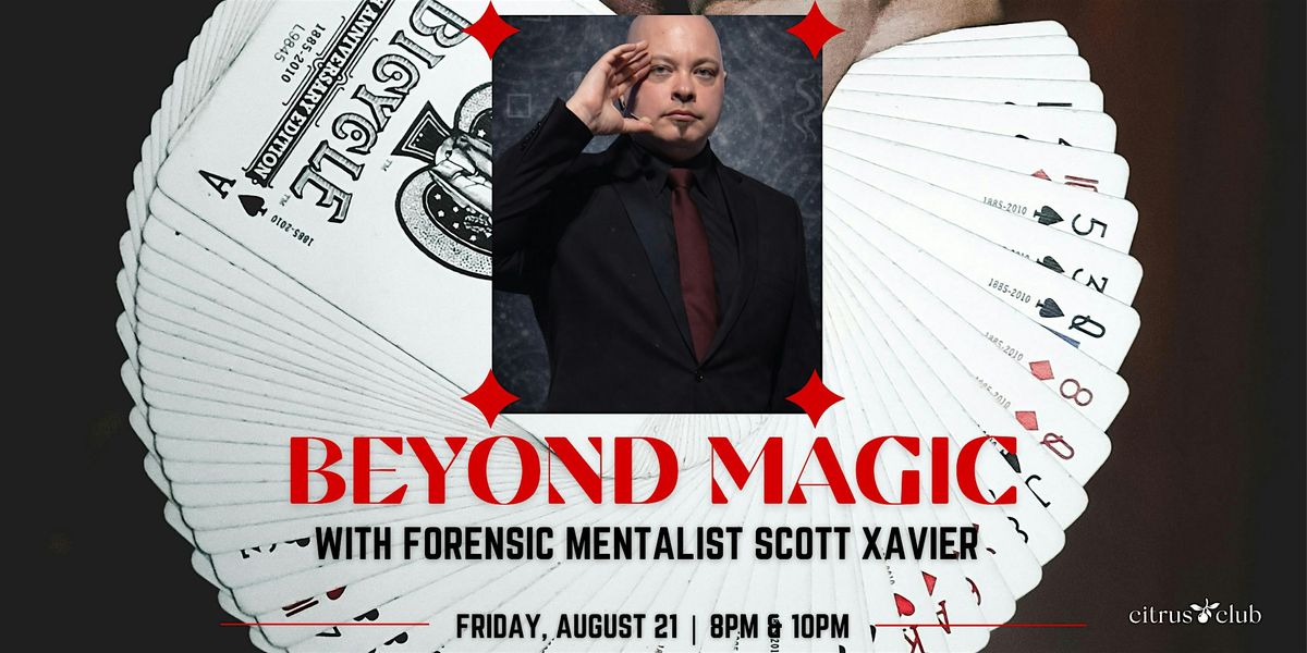 You are cordially invited to an evening of intrigue and illusion at Beyond Magic with Forensic Mentalist Scott Xavier. Experience a live performance that will challenge your perception and leave you questioning what’s possible. ✨