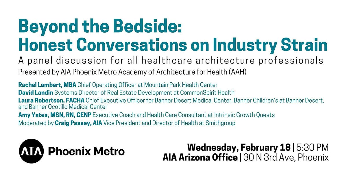 Join the AIA Phoenix Metro Academy of Architecture for Health (AAH) for a panel discussion with local health industry leaders as they share their perspectives on what is keeping them up at night- and how they are navigating the uncertainties and pressures they are facing.