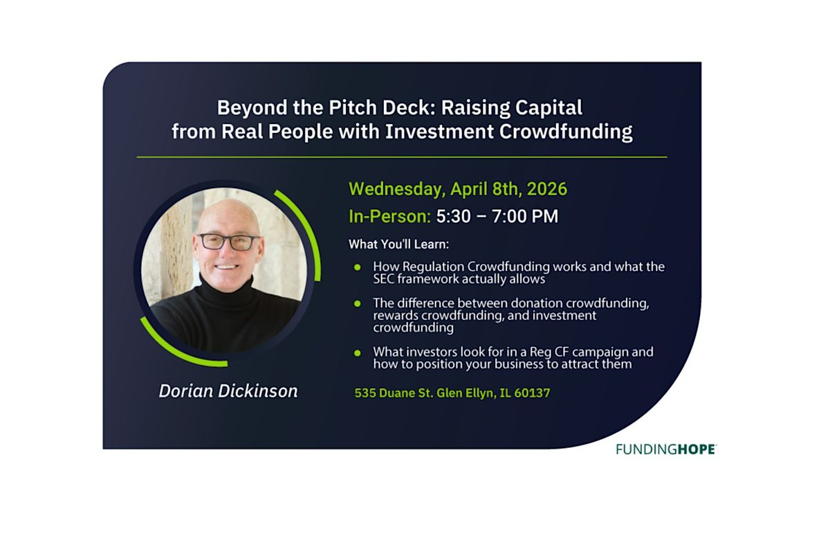 Most founders chase venture capital. Few get it. Investment crowdfunding opens a different door where your community, customers, and believers become your investors. In this interactive workshop, Dorian Dickinson, CEO of FundingHope, an SEC-registered investment crowdfunding platform, breaks down how Regulation Crowdfunding works, what separates campaigns that succeed from those that stall, and how emerging businesses at every stage can use it to raise real capital from real people, compliantly and strategically.