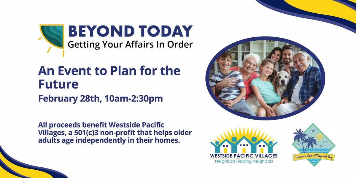 Join us for our 3rd annual Beyond Today educational program, hosted by Westside Pacific Villages and in partnership with the Woman's Club of Playa del Rey. Attendees will learn practical ways to plan and prepare for the future, whether for yourself or for a loved one. WPV and our expert speakers will be there to provide information and resources to guide you on this important journey. We will cover topics such as home health care, estate planning, reverse mortgages, maximizing retirement income, how to leave a lasting legacy for your loved ones, and how WPV provides support and social connection for people who are aging in place.