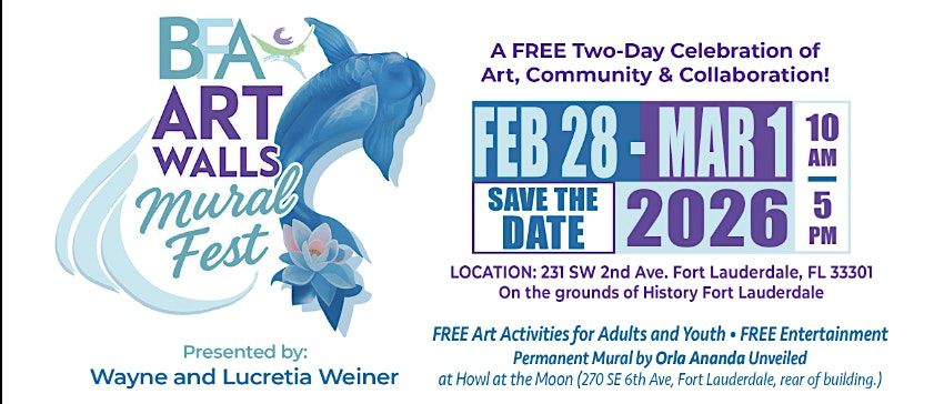 Join us for the BFA Art Walls Mural Fest presented by Wayne and Lucretia Weiner, a vibrant, community-driven celebration of public art, creativity, and connection in the heart of downtown Fort Lauderdale.