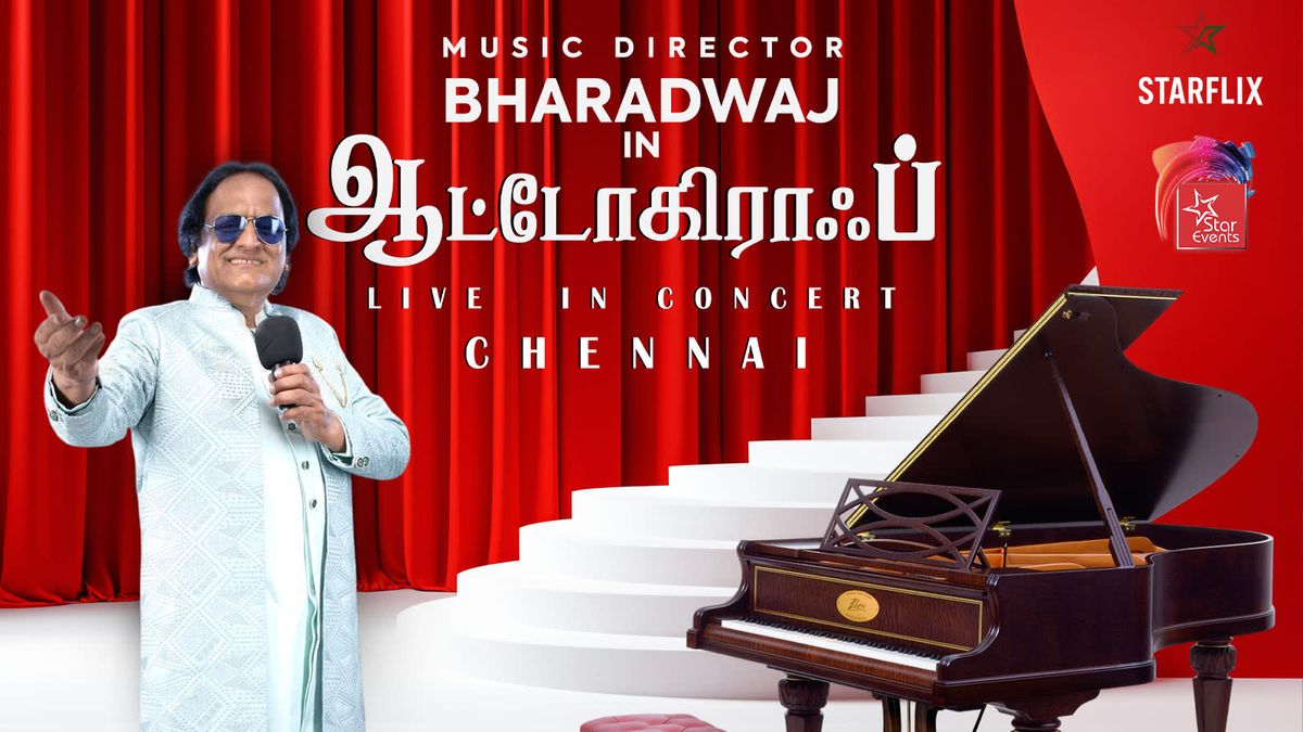 Come and witness the first time ever biggest live performance of Bharadwaj. He is one of the Top Music Composers of the Indian Music Industry having scored music for more than 100 feature films, Recipient of the prestigious KALAIMAMANI AWARD conferred by the State Government of Tamil Nadu, he has been a very successful commercial music composer with many of his songs becoming ‘chart busters’. Like “Unnai Parthapinbu” (Kaadal Mannan), “Satham Illatha Thanimai Kaeten” (Amarkalam), "Thala pola varuma" (Attakasam), “Avaravar Vazhkayil”, "Thozha Thozha" (Paandavar Bhoomi), “O Podu” (Gemini), “Apple Penney” (Roja Koottam), Unai Naan Unai Naan”, "Kadhal Mazhaiye" (Jay Jay), “Gnabagam Varuthey” (Autograph), “Kaadu Thirandey, “Siruchi Siruchi Vanthan” (Vasool Raja MBBS), “Oru Vaarthai Ketka” (Ayya), “Thaiyatha Thaiyatha”, "Poi solla poren" (Thiruttu payale), “Meendum Palliku Pogalam” (Pallikoodam), “Margazhiyil Kuluchiparu” (Onbathu Roobai Notu), “Hey Dushyantha” (Asal) etc.His composition “Ovvavaru Pookalume” in the Tamil Film "Autograph” won the National Award for Best Singer and Best Lyric writer in the year 2004.Bharadwaj has composed THIRUKKURAL in musical form. He has composed and sung all the 1330 Kurals , a unique feature.Get ready Chennai for a magical mesmerizing performance of Bharadwaj with stunning visuals and high quality sound with grand spectacular stage. This will be a once in a life time experience don't miss it.....