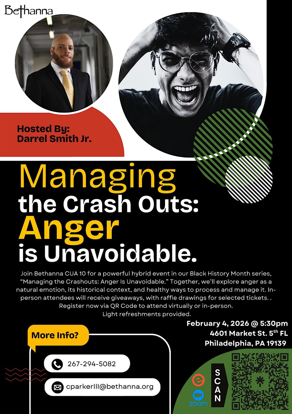 Join Bethanna CUA 10 for a powerful hybrid event in our Black History Month series, “Managing the Crashouts: Anger Is Unavoidable.” Together, we’ll explore anger as a natural emotion, its historical context, and healthy ways to process and manage it. In-person attendees will receive giveaways, with raffle drawings for selected tickets. Light refreshments provided.