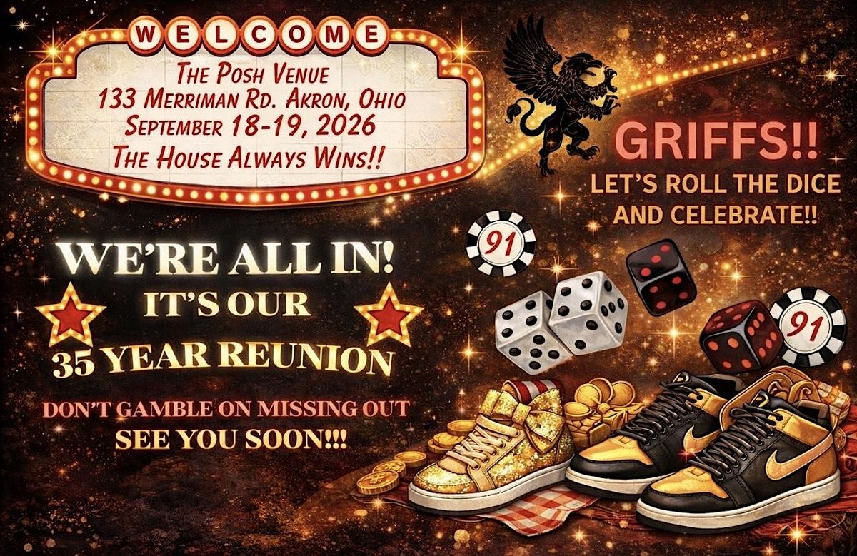 Best Dressed Griff & Griffin WIN prizes, so don’t hold back! Let’s celebrate 35 years in true Class of ’91 fashion — bold, stylish, and unforgettable. The House Always Wins when Griffs are in the building!