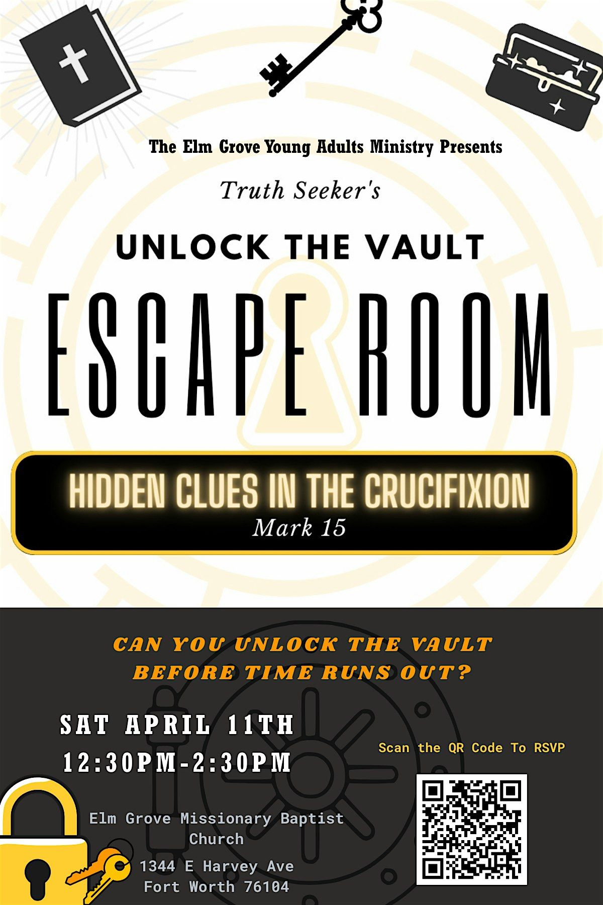 Join us for an interactive, faith-based escape room designed for young adults ages 19-35, where you’ll work together to solve clues, uncover truth, and walk through the events surrounding the death and resurrection of Jesus.