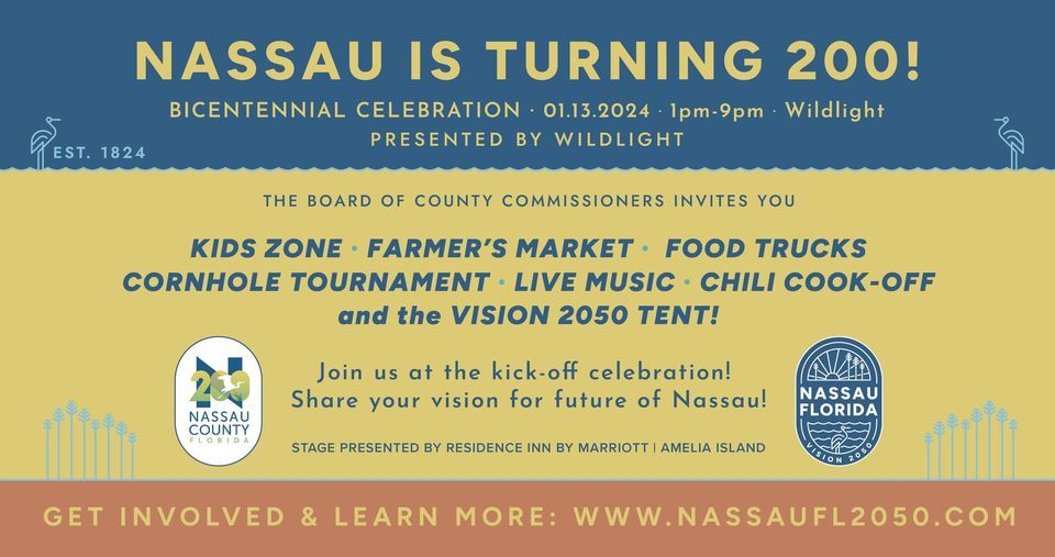 The Bicentennial Kick-off, brought to you by Wildlight, on Saturday, January 13, 2024, from 1:00 – 9:00 p.m. at Wildlight (Tinker Street). This free event will include activities for all ages and interests including live music, a kids zone, vendors, food trucks, a chili cookoff, a cornhole tournament, and a Vision 2050 tent where you can give your input on the County’s next 25 years and win some cool swag!Featured on the Residence Inn by Marriott | Amelia Island music stage is Nassau County’s very own flipturn, an indie-rock band originating from Fernandina Beach. Special guests include: Honey Hounds, The Band Be Easy, and Firewater Tent Revival.