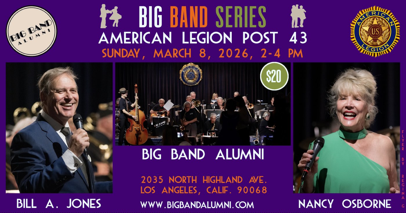 Join us Sunday, March 8, 2026 for our next Big Band Series Swing Dance Event with music by the Big Band Alumni of Los Angeles plus vocalists Bill A. Jones and Nancy Osborne at the American Legion Post 43, Hollywood, CA. Enjoy an afternoon of live music from a 17-piece big band and dance the afternoon away in the Cabaret Room of this historic venue. Show starts at 2 pm and goes until 4 pm. Entrance fee is $20 cash at the door. Free parking on site. If Post 43 runs out of spots, the Post 43 attendant will give you a pass to set on your dashboard viewable through the windshield to park at the Hollywood Heritage parking lot across the street.