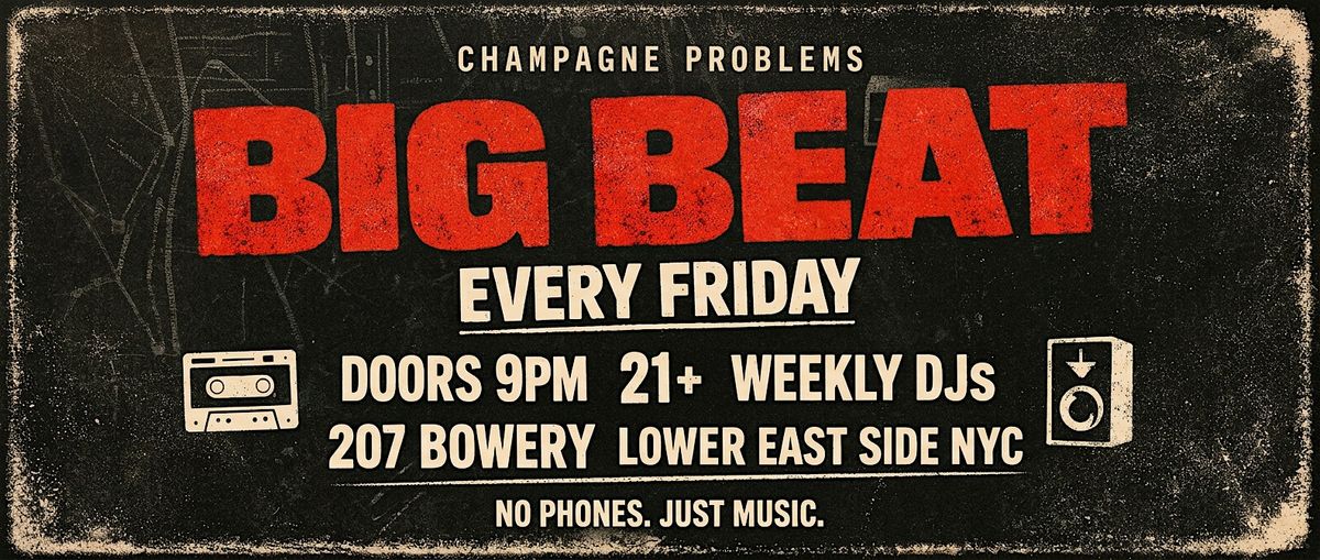 Fridays at Champagne Problems we are throwing our New Weekly party BIG BEAT FRIDAYS!!! We have an incredinle line up of rotating djs that will have you dancing all night every single Friday! Early Bird Tickets $10 or $20 Regular Tickets. Early Birds are limited so get them EARLY!