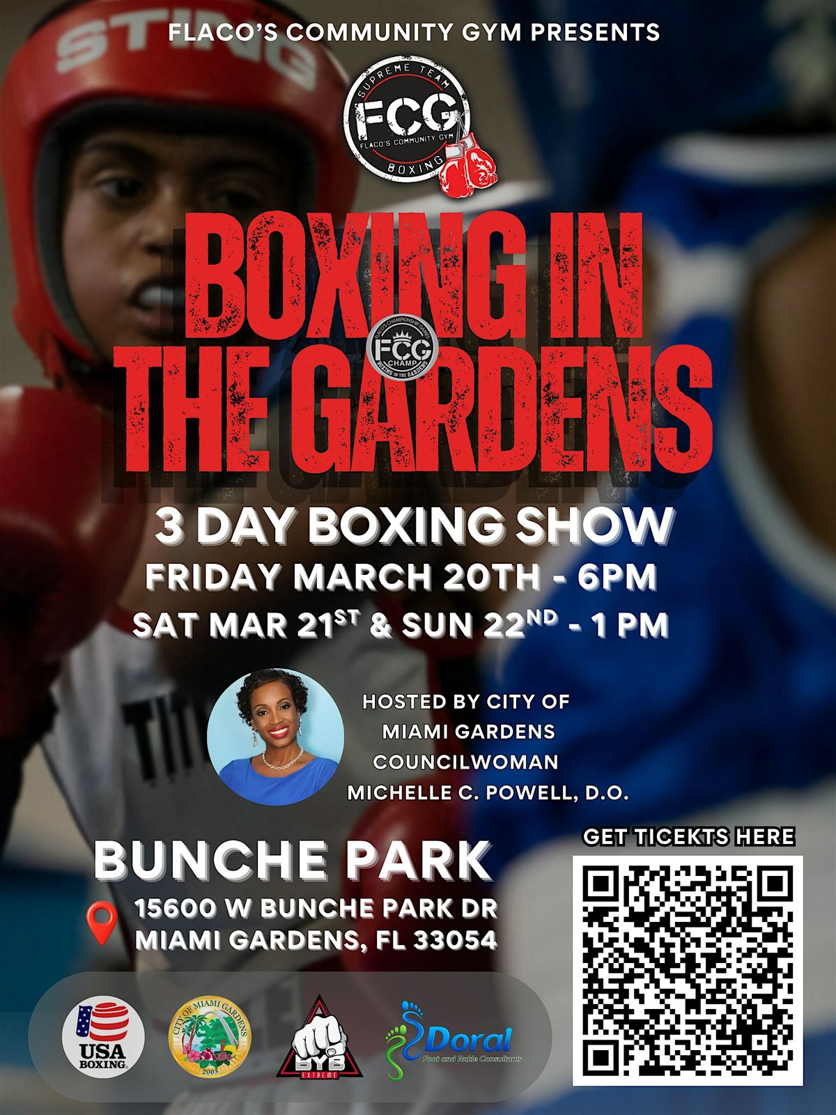 3-day amateur boxing showdown at Bunche Park! Mar 20–22. Hosted by Flaco's Community Gym & City of Miami Gardens. Get your tickets now!