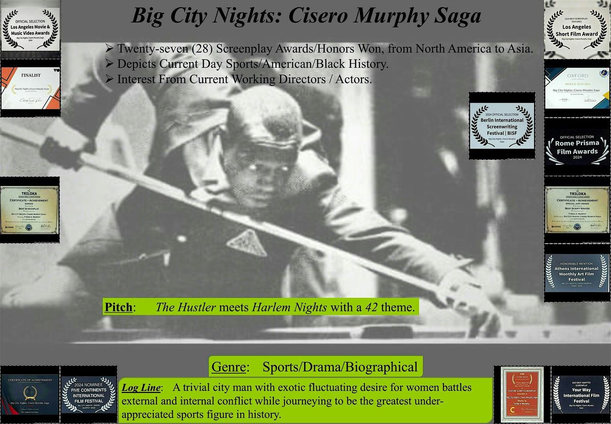 MES authored his internationally recognized book, Big City Nights: The Biography of The Legendary Cisero Murphy & developed the 28x Foreign & Domestic Award-winning Screenplay, Big City Nights: Cisero Murphy Saga. The proceeds of this event will go towards its development, which has well-known current entertainment figures interested.