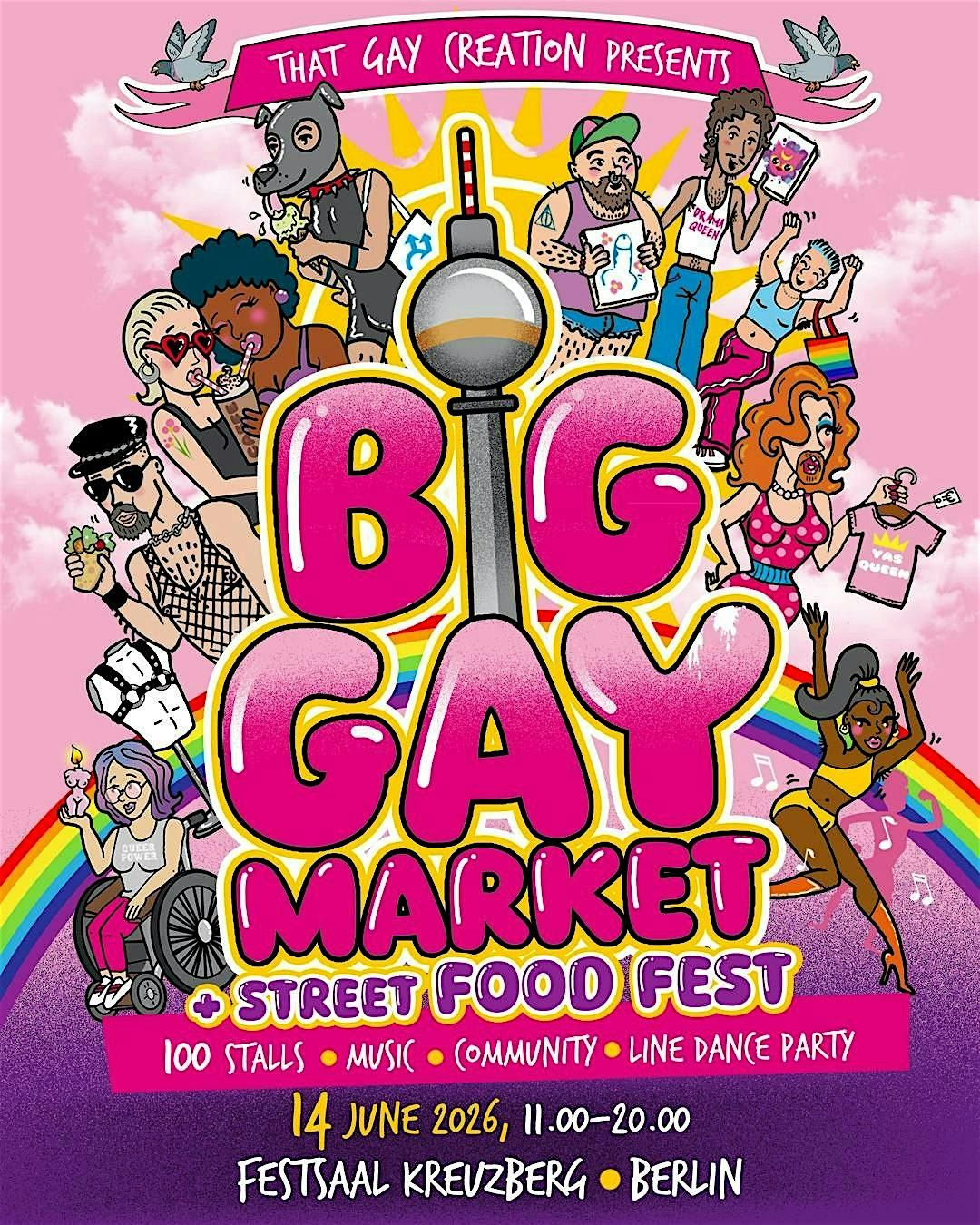 The Big Gay Market is coming to Berlin â a full-day event bringing together queer creativity, independent brands, and community under one roof. On June 14th 2026, Festsaal Kreuzberg will transform into a vibrant marketplace featuring 100+ curated stalls, street food, drinks, and a full day of music and programming.
