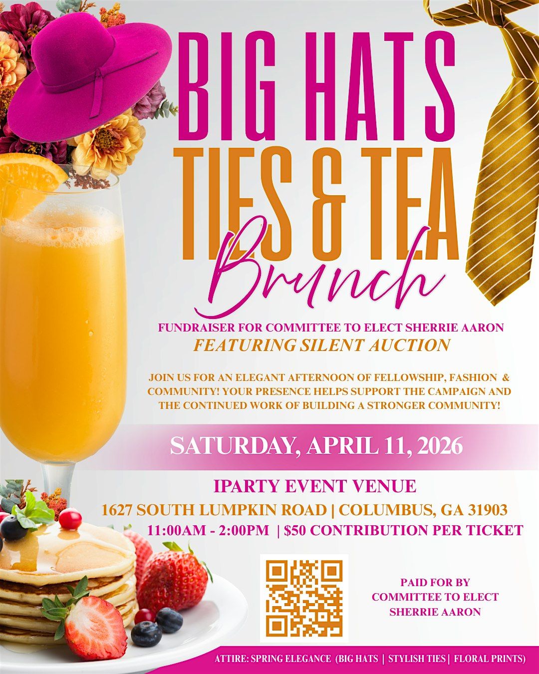 Big hats, bold ties & brunch with purpose! Join us for fashion, fellowship & a silent auction supporting Sherrie Aaron’s campaign.About this Event