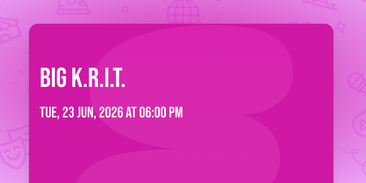 ✨ Enter a world of endless possibilities at Big K.R.I.T., where every moment tells a story! 🏛️ The stunning New Daisy Theatre in vibrant Memphis, TN transforms into a realm of wonder on June 23rd, 2026 at 06:00 PM. 🌟 They have crafted an experience that goes beyond the ordinary, combining elements of surprise, delight, and pure entertainment. Every detail has been thoughtfully considered to ensure your journey with us is nothing short of extraordinary. 🎯 Join fellow adventure seekers and memory makers in this celebration of imagination and innovation. 🎊 Reserve your spot today and be part of something truly special!http://maps.seatics.com/GeneralAdmissionEvent_2018-10-03_1713_SVGC_tn.gif