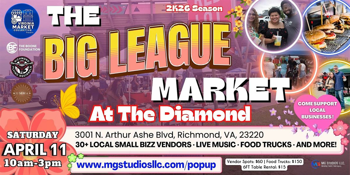 Get ready for an exciting day of shopping, food, music, and community at The Big League Market at The Diamond in Richmond! Hosted by The Virginia Market Collective, a program of The Boone Foundation Group, this outdoor pop-up market brings together local entrepreneurs, artisans, and food vendors for an unforgettable marketplace experience.