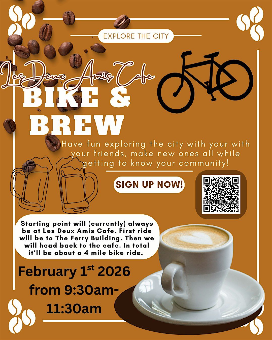 With this monthly bike club, we'll get to know The City and each other by exploring different bike routes, tourest destinations and so much more. The starting and returning point will always be at the cafe Les Duex Amis. This club is meant to be fun and a way to make new friends, so everyone of all levels of stamina are welcomed. After we return back to the cafe we'll have a "Brew" wether thats some brewed coffee, beer or any other delicious drinks the cafe has to offer. We look forward to riding and connecting with you, see you soon! The bike club is hosted by Salem the assistant manager of the cafe, but we more than welcome the oppourtunity to have different Hosts/Bike leads in the future as specialty rides. Safety is our top priority, please wear a helmet and have the neccessary protective equipment on your bike (lights, bells etc), thank you