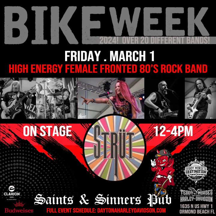 BIKE WEEK 2024!!! The Official Start with Strut - High Energy Female Fronted 80s' Rock Band on stage Friday, March 1 from 12-4 pm!******