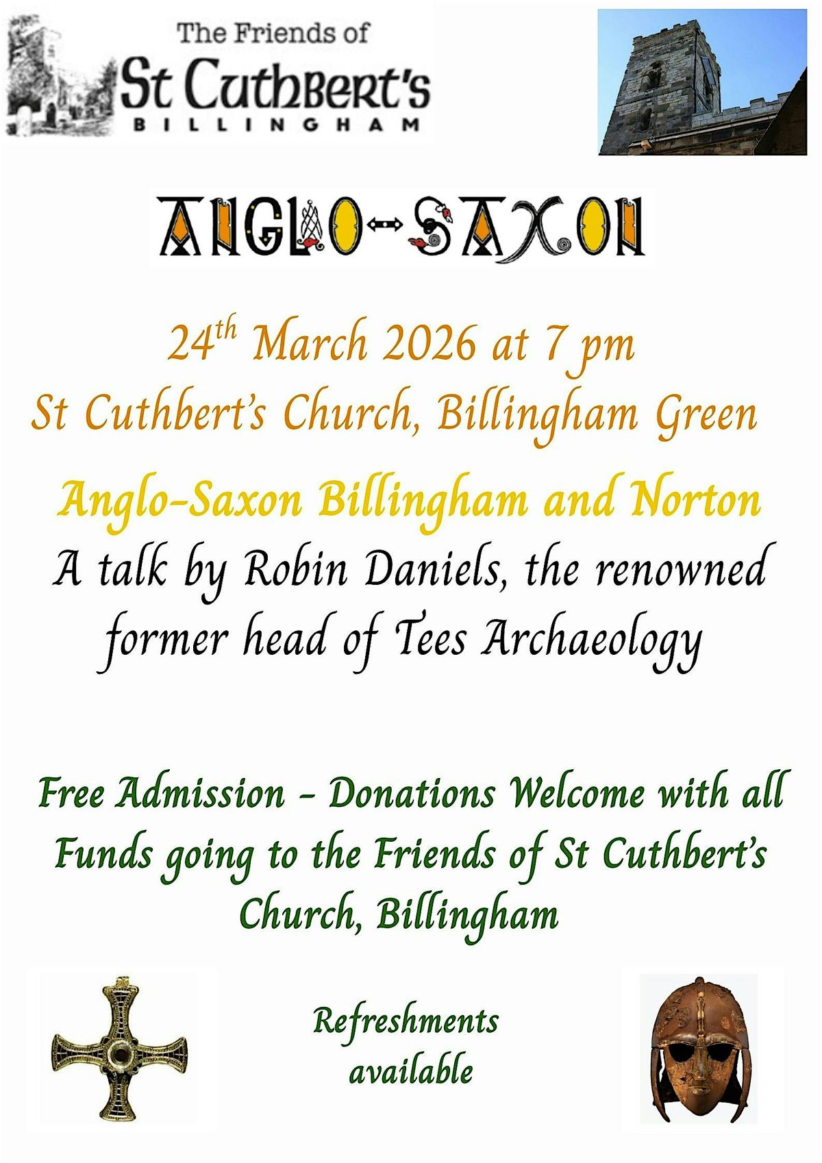 Join us at St Cuthbert's Church on March 24, 2026 at 7:00 AM (GMT) for a fascinating talk by Robin Daniels. Dive into the world of Anglo Saxons and discover the history behind Billingham and Norton. It’s a relaxed, informal event perfect for history buffs or anyone curious about the past. Don’t miss out on this chance to learn and chat with fellow enthusiasts in a friendly setting! Entry by donation. Refreshments available.