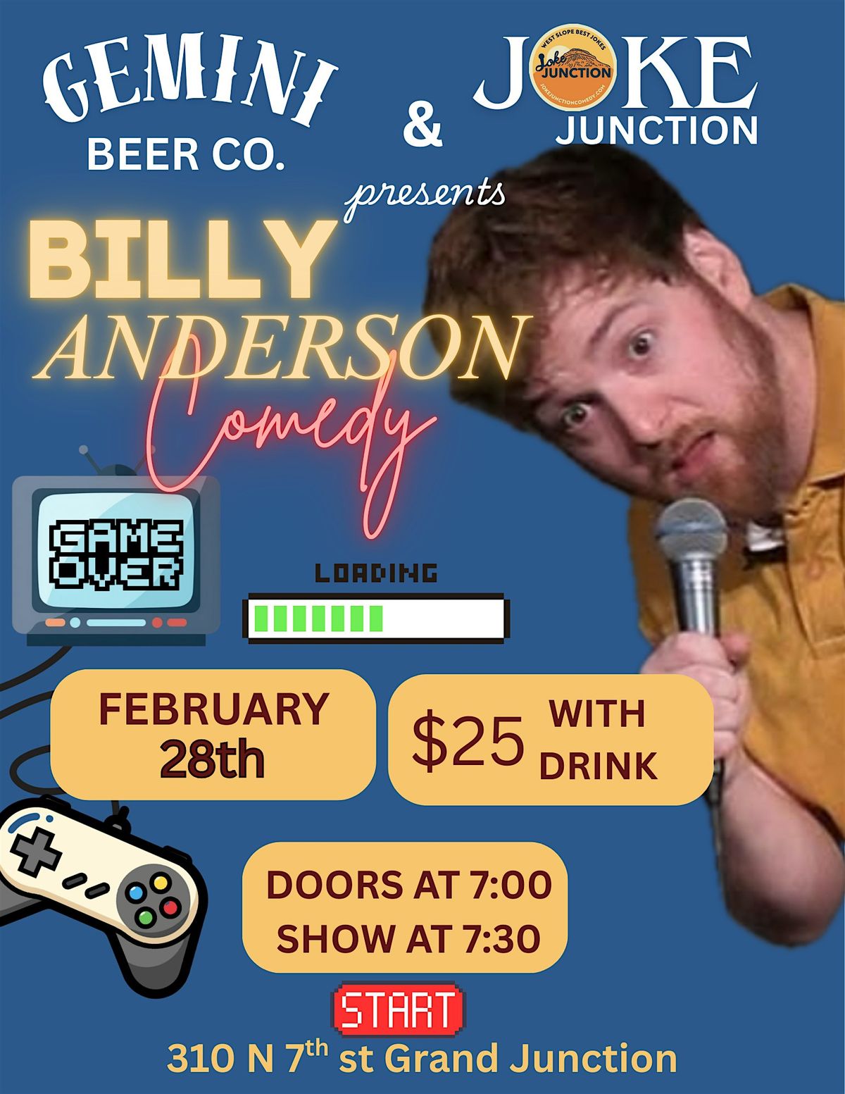 CREATOR OF THE GATE WAY SHOW, IT'S BILLY ANDERSON. COME OUT FOR A WILD EVENING OF LAUGHS. THIS TICKET COMES WITH A DRINK. SEE YA THERE!