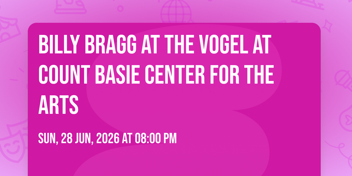 🎉 Prepare to be amazed at Billy Bragg at The Vogel at Count Basie Center for the Arts, the most anticipated gathering of the season! 🌟 Set against the stunning backdrop of The Vogel at Count Basie Center for the Arts in vibrant Red Bank, NJ, this event promises to redefine your expectations. 📅 Mark your calendars for June 28th, 2026 at 08:00 PM and get ready to immerse yourself in an atmosphere of wonder and excitement. ✨ From the moment you arrive, you'll be transported into a world where memories are made and stories come alive. They have crafted an experience that perfectly harmonizes entertainment, innovation, and community spirit. 🌈 Join us as we create moments that will be discussed for years!