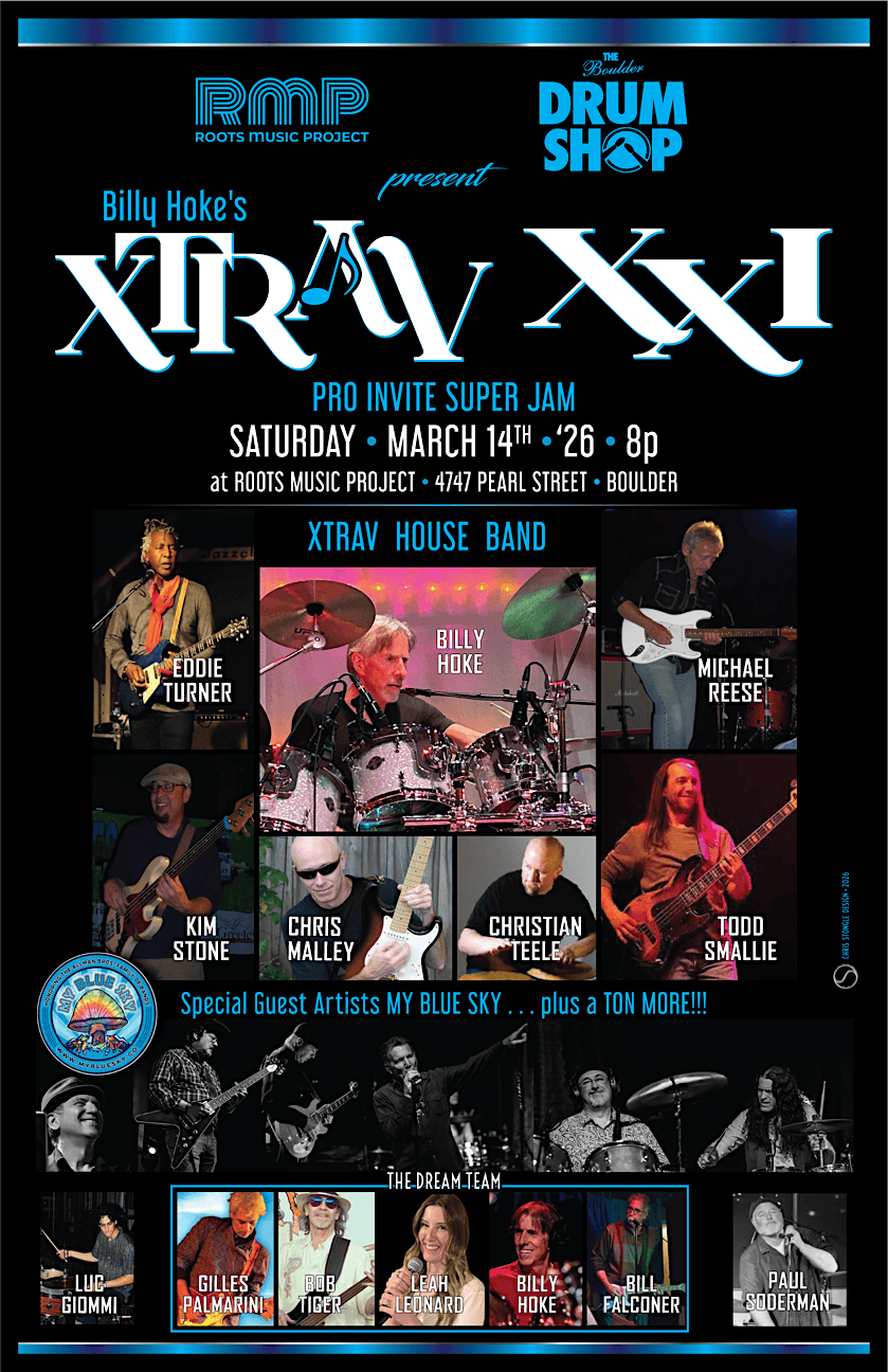 Founded by Billy Hoke (Boulder Drum Shop) and Dan King (Blues & Greens Blues Club), the XTRAV was created with one ambitious vision: to host the ultimate professional jam session west of the Mississippi. After sixteen stellar sessions at the Blues & Greens Blues Club, this musical phenomenon is being resurrected by the Boulder Drum Shop and Roots Music Project.