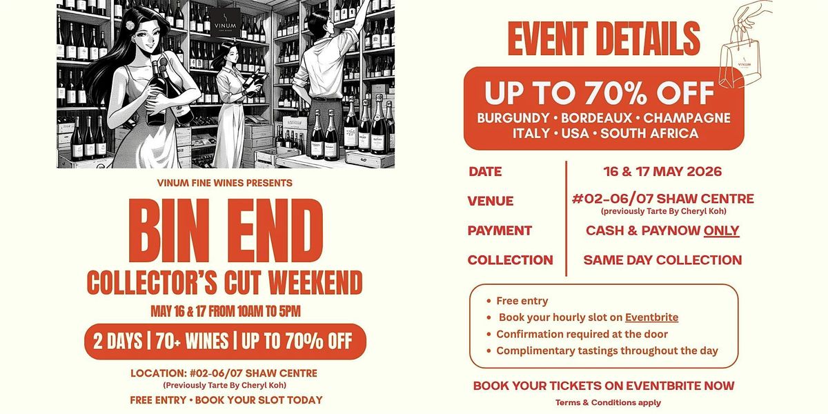 Two days only, we're taking our cellar out of the warehouse and into Shaw Centre. Drop in at #02-06/07 for a casual walk-in tasting and sale, with up to 70% off a hand-picked selection of Bordeaux, Burgundy, Champagne, Italy and a few from further afield. All chosen for quality, all priced to go.