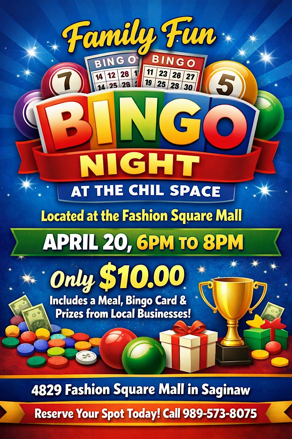 Family Fun Bingo Night! Join us at the Fashion Square Mall for an exciting Bingo night on April 20 at our new Chil_Space Event