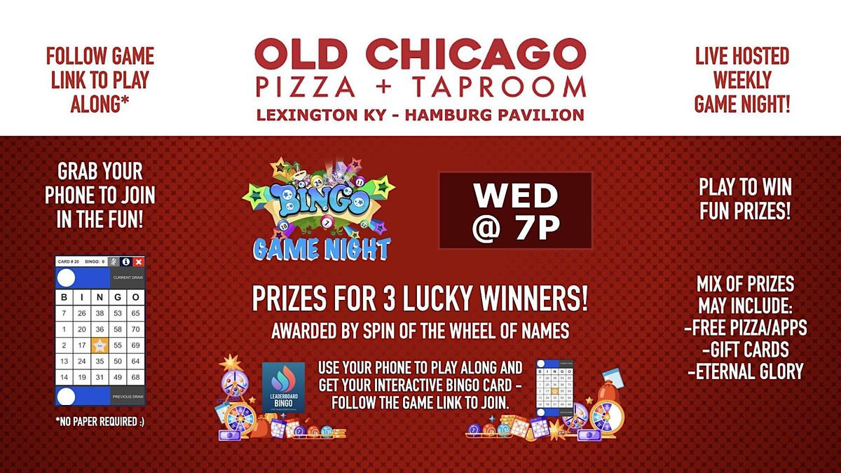 Old Chicago - Lexington KY hosts the BINGO Game Night every Wednesday at 7p - Join us for great beer, food, fun and PRIZES!