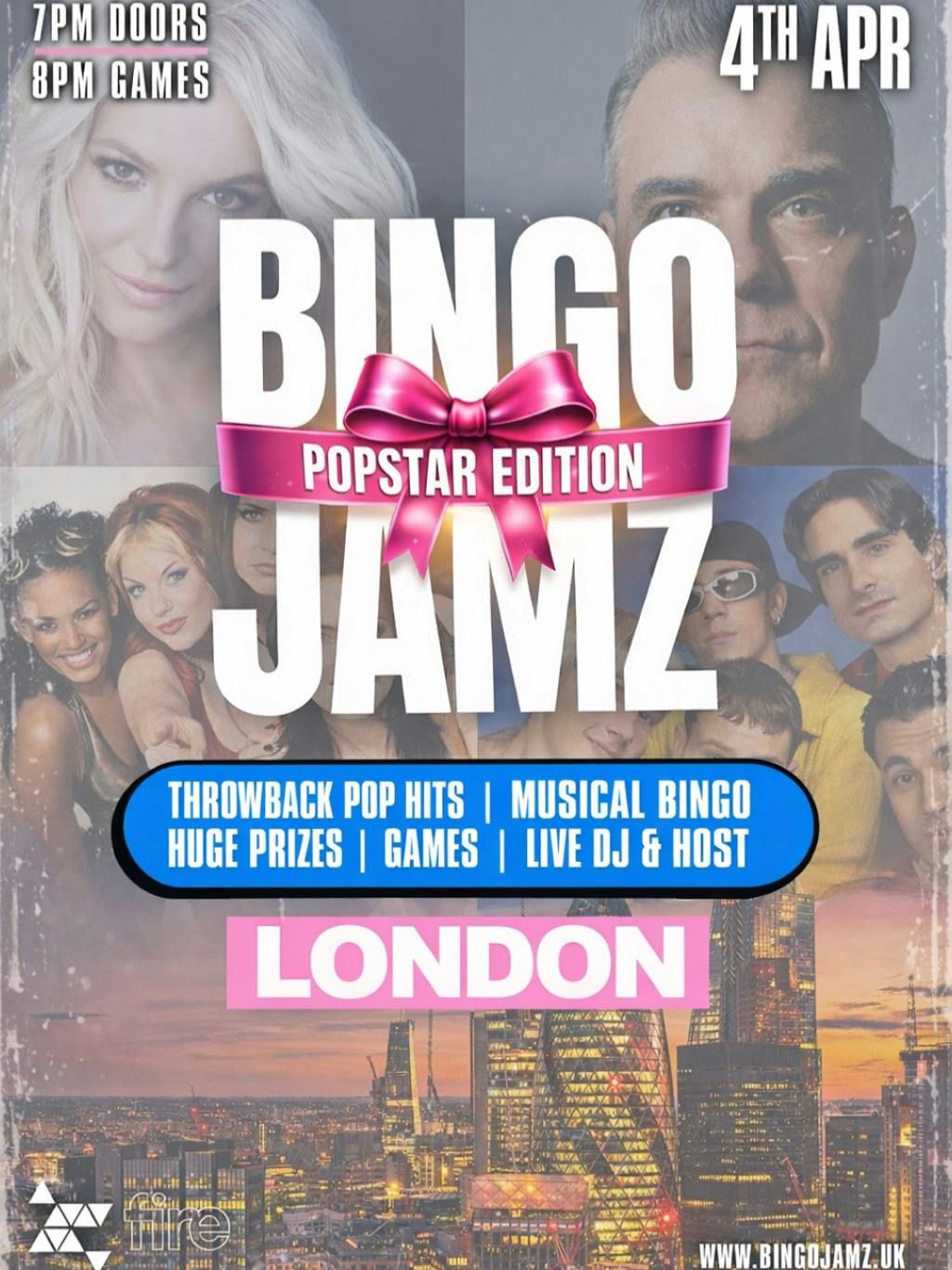 π Welcome to BINGO JAMZ: POPSTAR EDITION β our brand new pop experience!Get ready for a high-energy night of immersive games, prizes, and the ultimate 90s & 00s pop anthems β the ones you know every word to.