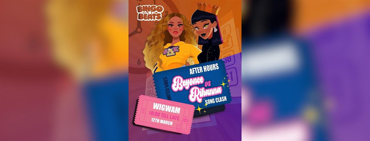 Welcome to Bingo N Beats - After Hours Song Clash - Beyonce vs Rihanna! Get ready for a night of epic showdowns between these two iconic queens of music. Join us at Wigwam on March 12, 2026 at 6:00 PM (Europe/Dublin Timezone) for a battle of hits, dance-offs, and bingo fun!