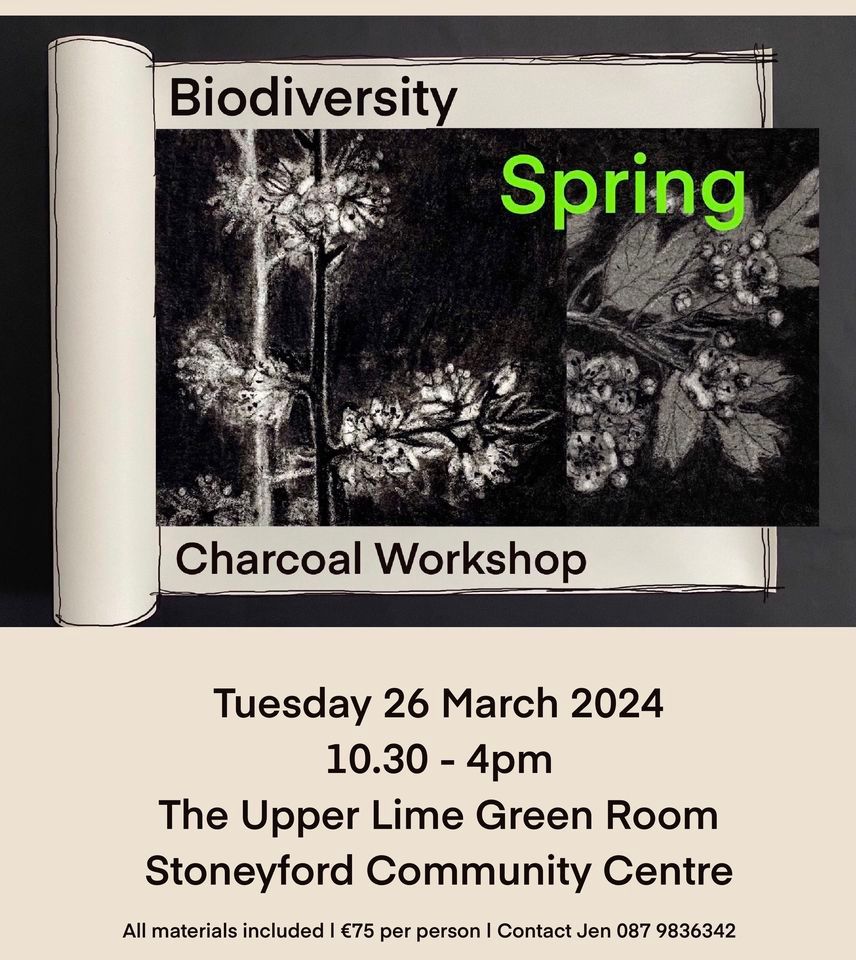 ‘Biodiversity | Spring’ Charcoal workshop Tuesday 26 March at 10.30 - 4pm at the Upper Lime Green Room at the Stoneyford Community Centre, Co Kilkenny.