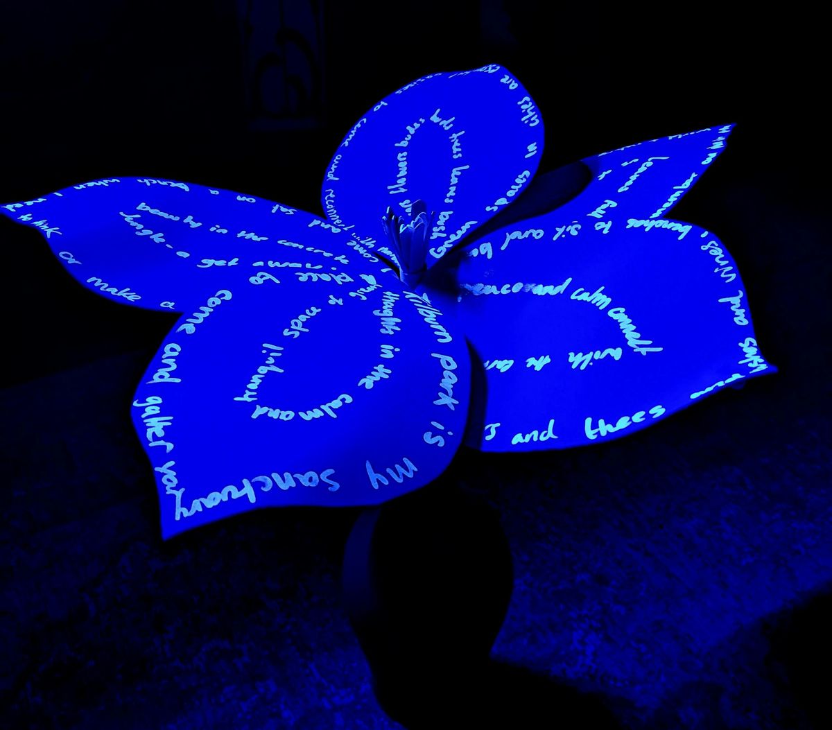 Following the workshop, the flowers will be installed together as a collective garden, building on an existing body of 30 flowers. When illuminated with UV lighting, the text, patterns and markings glow vividly, transforming the handmade forms into a softly luminous landscape.