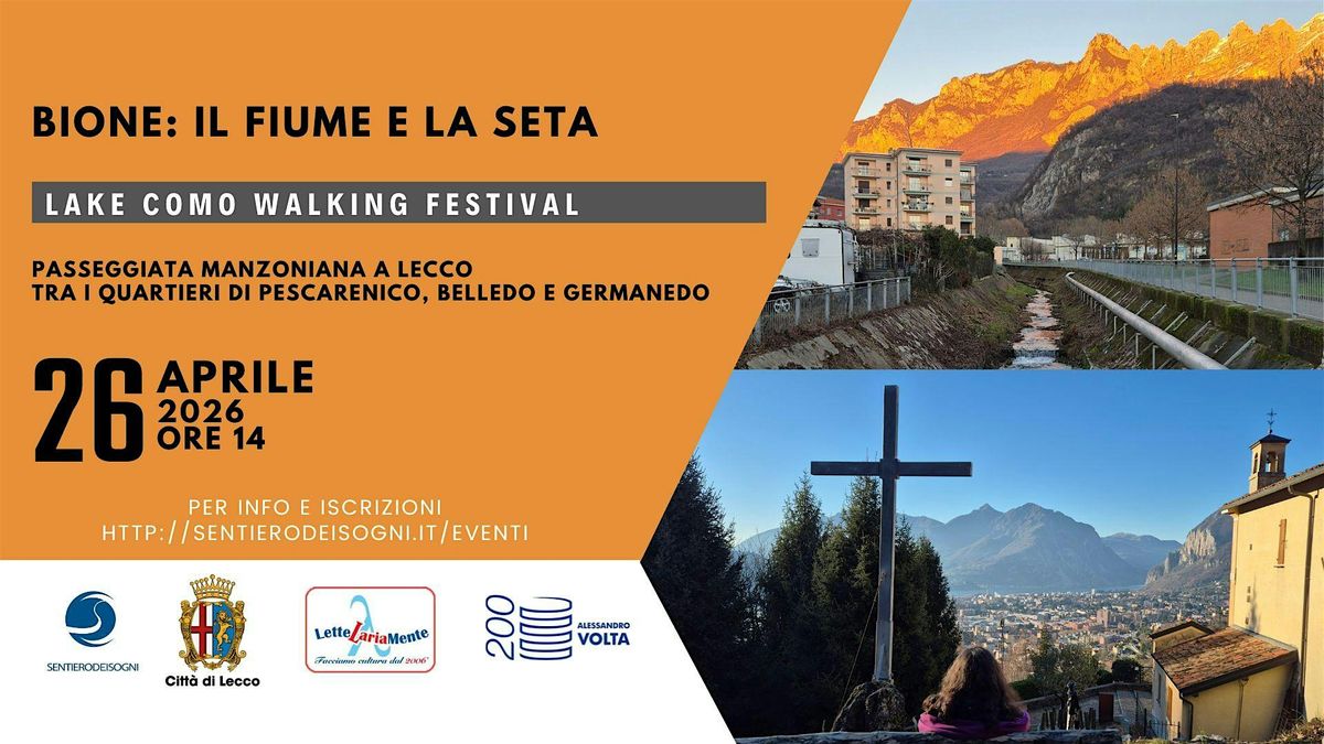 Ritrovo domenica 26 aprile, ore 14, in piazza Era a Lecco, in località Pescarenico. In un cammino di circa 4 chilometri (solo andata) si attraverseranno i quartieri di Pecarenico, Belledo e Germanedo, seguendo il corso del torrente Bione e scavando nella memoria dei luoghi che ha contribuito a plasmare. Partenza dallo scenario dell'"addio ai monti", passo più celebre dei "Promessi sposi", tappa intermedia al circolo Arci di Germanedo che si chiama proprio come il capolavoro di Alessandro Manzoni, e conclusione al Santuario della Madonna della Rovinata, che sarà aperto per l'occasione e dal quale si gode anche di una straordinaria vista sulla città di Lecco, sui monti e sul lago. Renzo e Lucia, due operai tessili come molte persone di queste zone, saranno compagni di viaggio attraverso alcuni momenti di lettura.