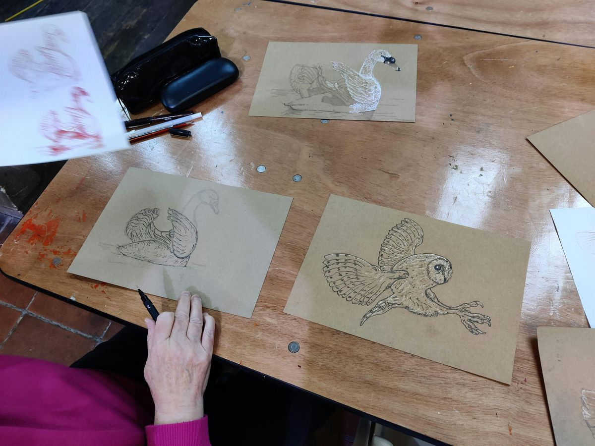 Join Michael in this wonderful 3 hour workshop. You will be guided in how to draw a bird using basic shapes and address superficial anatomical structure. Bird talons, wings, and head will be discussed.