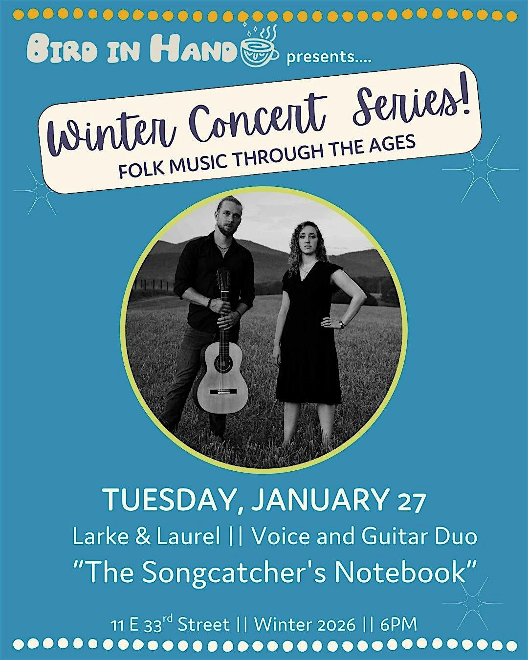Bird in Hand welcomes you back to our seasonal concert series! Winter of 2026 is filled with storytelling through music. From ballads and ancient heros to seafaring songs and unrequited love, there is a bit of everything. Folk music with influences from around the world to our own backyard will invite you inside to cozy up with a tasty winter latte or cocktail. This concert series is free, and donations to directly support the artists are welcome.