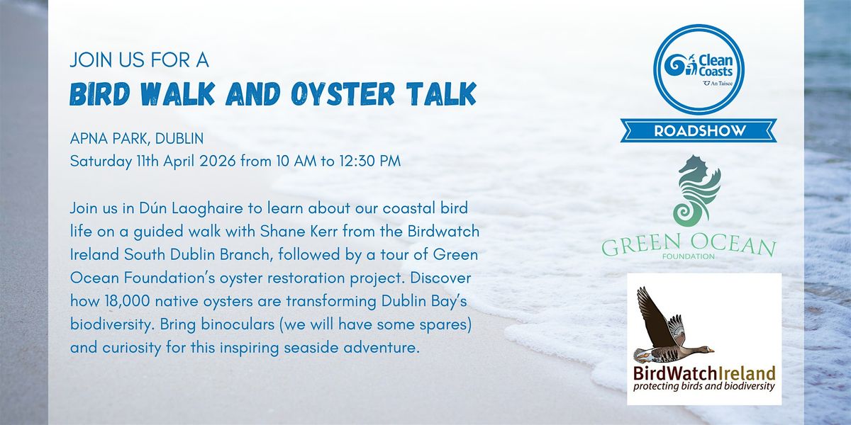 Join us in Dún Laoghaire to learn about our coastal bird life on a guided walk with Shane Kerr from the Birdwatch Ireland South Dublin Branch, followed by a tour of Green Ocean Foundation’s oyster restoration project. Discover how 18,000 native oysters are transforming Dublin Bay’s biodiversity.