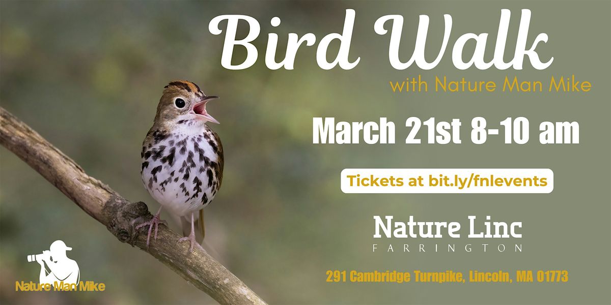 Join Michael Bryant, Nature Man Mike, for a bird walk through the Farrington Nature Linc site. This two-hour walk is suitable for beginners as well as more experienced birders. Limited loaner binoculars will be available to borrow on a first come, first serve basis, but you are encouraged to bring your own if you have them.