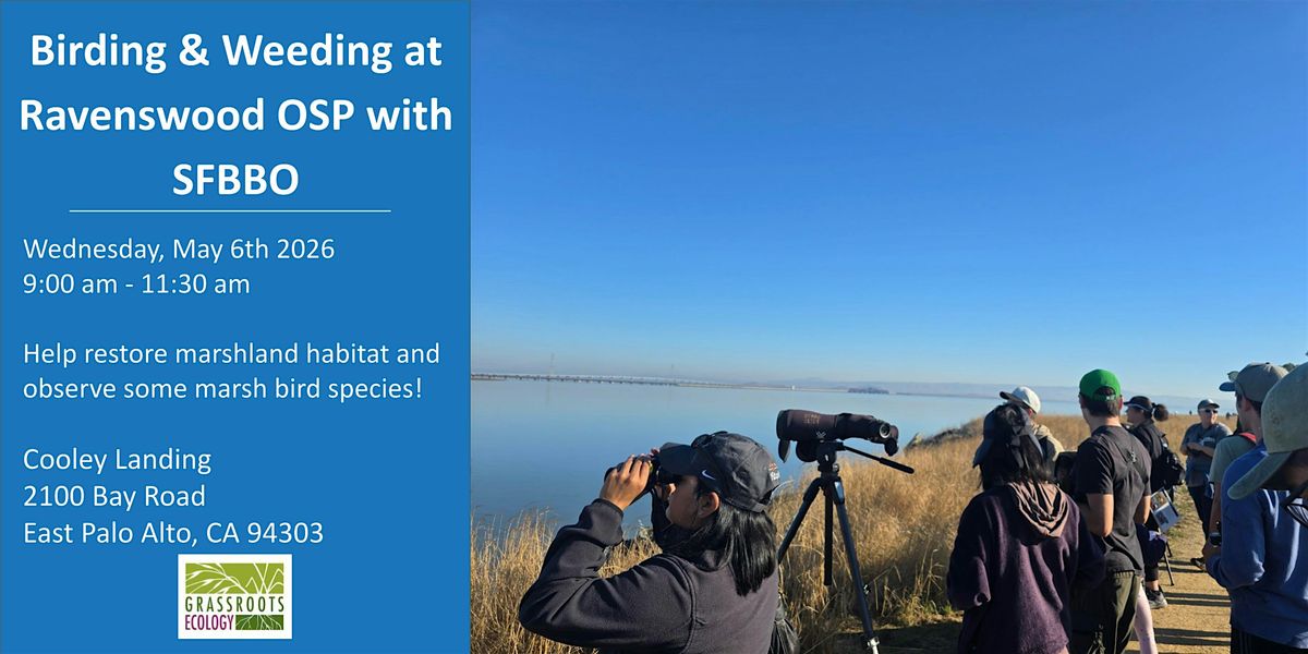 This event will be co-hosted by Grassroots Ecology and San Francisco Bay Bird Observatory. We will be working together to improve our habitat restoration areas by weeding nonnative plants to support wildlife. Workday tasks will include using hand tools, bending, kneeling or sitting on the ground, and walking on possible wet uneven terrain carrying supplies.
