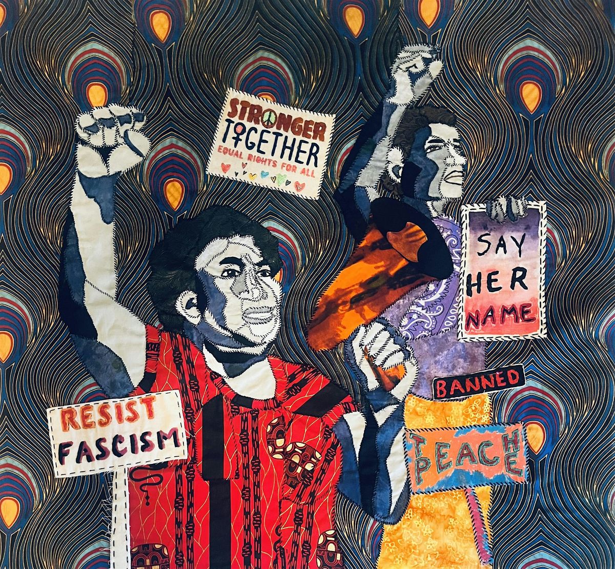 Ayers’ personal artwork in textile arts explores spirituality, tradition, and belief systems drawn from African and American cultures. She works with ethnic, hand-dyed, and repurposed fabrics, found objects, and collected artifacts, using layering and hand-stitching to create rich textures that reimagine the practices of her childhood through a contemporary lens.